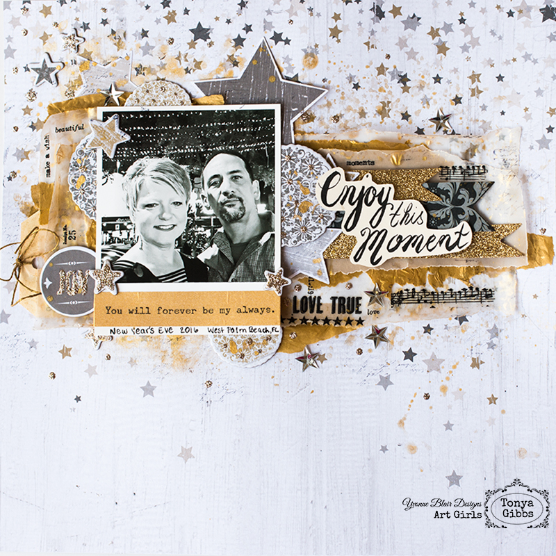 To accent this photo I used Yvonne's Stamp on one of the note labels in the paper collection. Most of the paper has gold foiling, and I used the foiling sheets to accent my photos. I decided to heat emboss The History of Ever Sentiment with Gold Foil